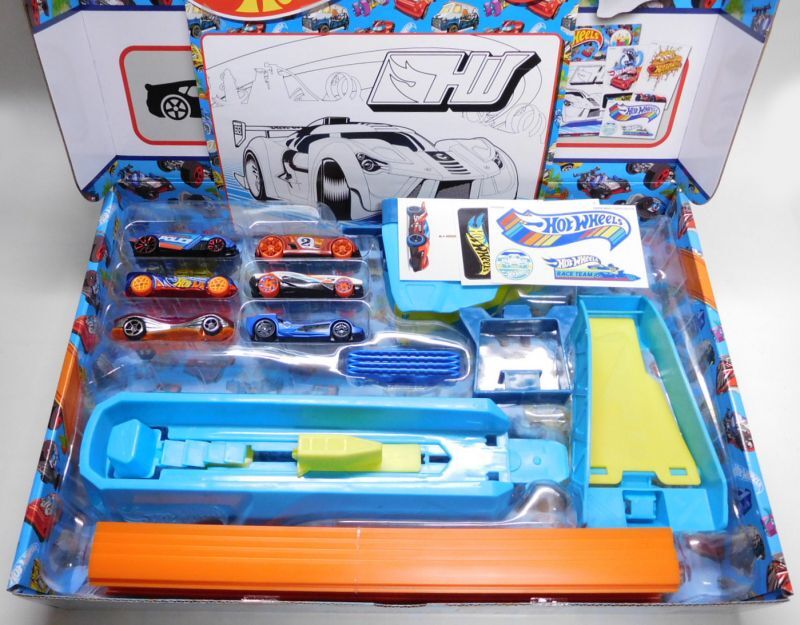 【HW CELEBRATION BOX】 ミニカー6台、プレイセット、塗り絵、シール3枚がBOXに入っています。