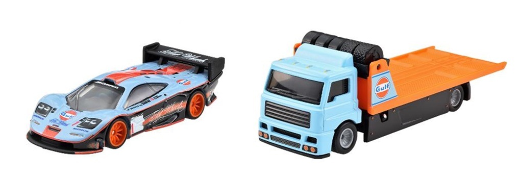 1901年創業の石油会社ガルフは、メキシコ湾に由来する社名を持ち、1960年代からレーシングチームを支援。水色とオレンジの“ガルフカラー”のマシンがル・マン24時間などで活躍し世界的に知られる存在となった。本セットにはル・マンを連覇したフォード GT-40や1997マクラーレン F1 GTRロングテールなどを収録。さらにホットウィールオリジナルのフリートストリートや、実在するデモカーをモチーフにしたトランジット スーパーバン(ガルフカラーはフィクション)もラインナップ。